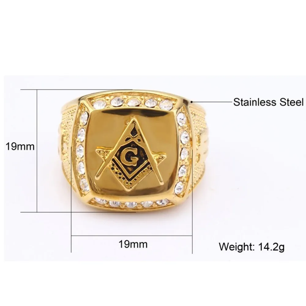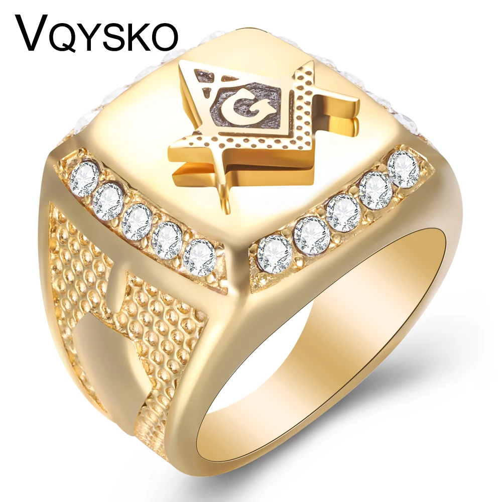New Arrival Bling CZ Crystal Men Rings With Freemason Masonic Free Mason Signet 316L Stainless Steel Gold Color Jewelry For Men